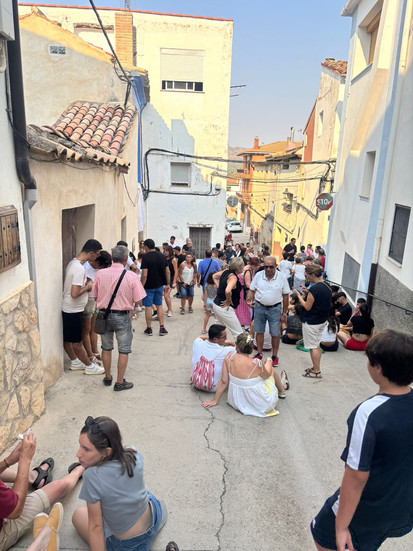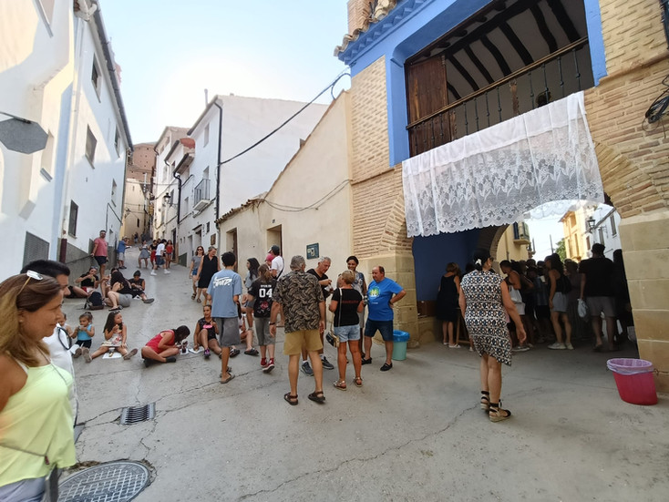 La ronda recorrió el pueblo, deteniéndose en cada casa para recoger a las majas de fiestas de este año. Cada parada fue un pequeño espectáculo, con jotas dedicadas, bailes y la calidez de vecinos y familiares que salieron a aplaudir y acompañar el recorrido.
